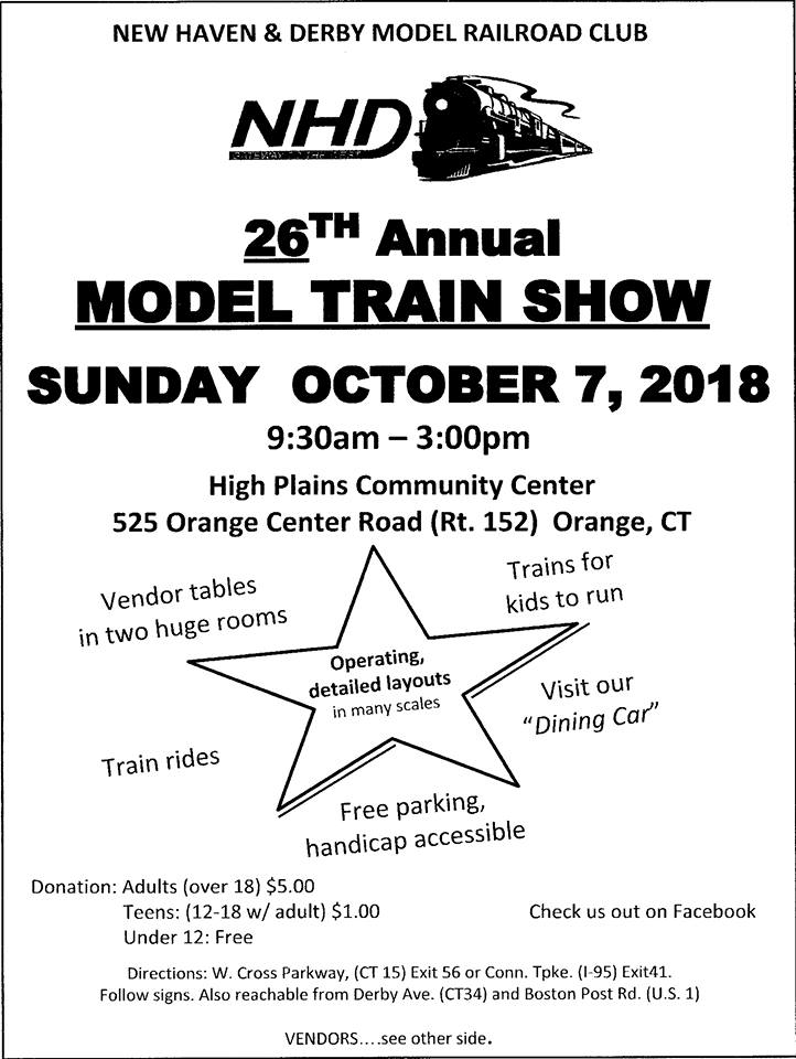 The New Haven and Derby Model Railroad Club will be holding their 26th annual model train show on Sunday, October 7, 9:30am-3pm. The event will be held at the High Plains Community Center, 525 Orange Center Road, Orange. In addition to the model trains, there will be vendor tables, train rides, and a dining car.